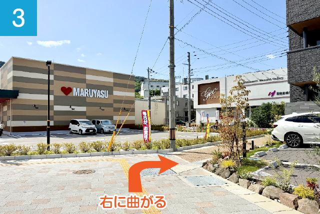 - スーパー(MARUYASU)まで来たら、右に曲がります。